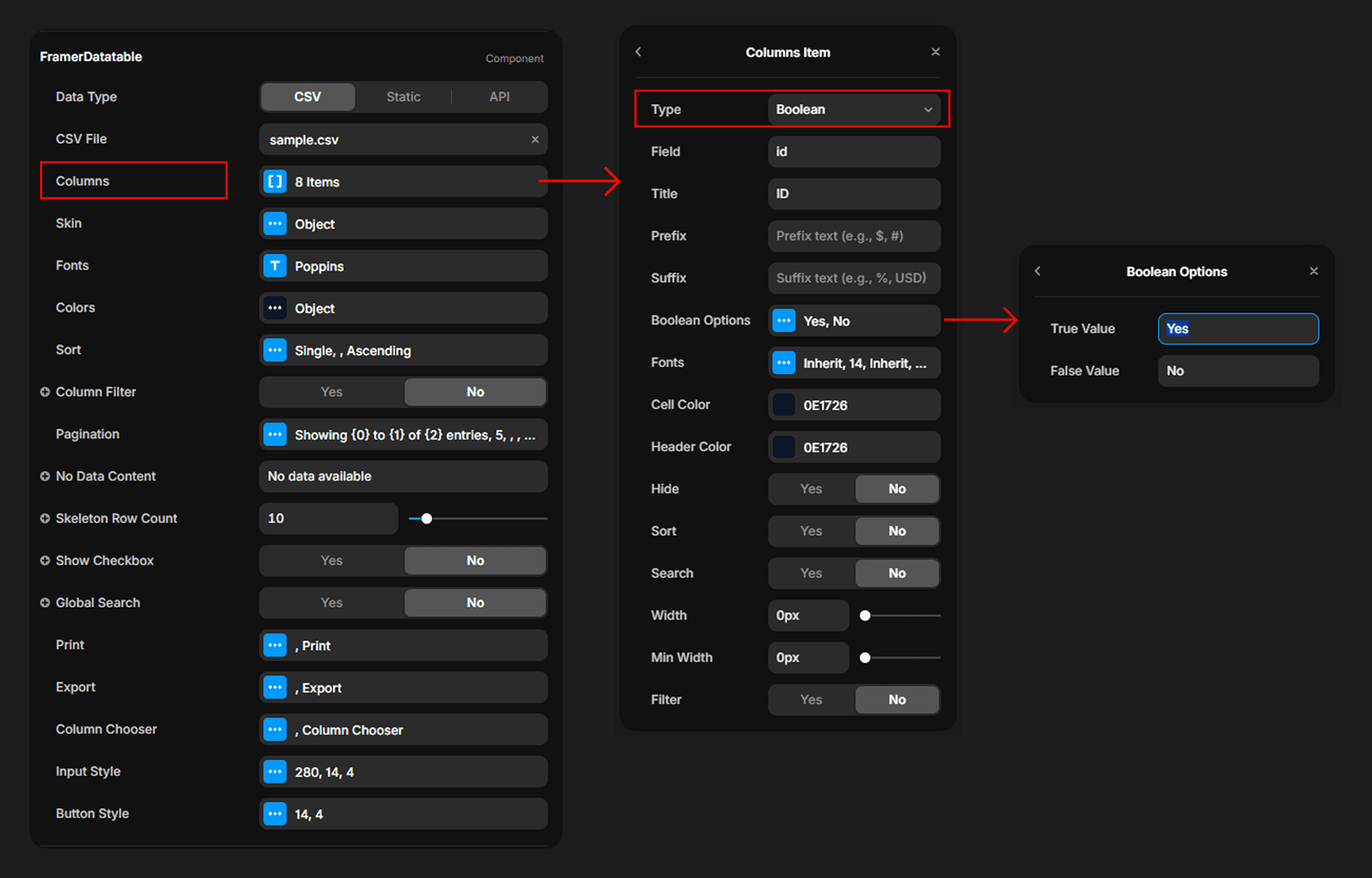 Displays true/false data as customizable labels (default: Yes / No).