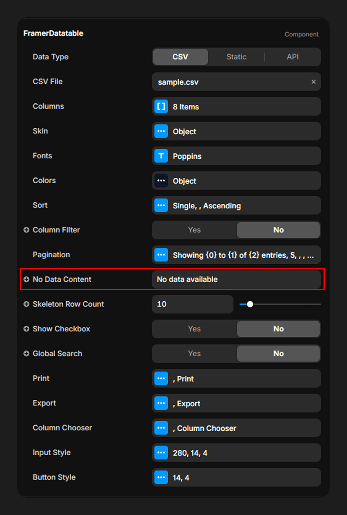 When no rows match the current filter or the data source is empty, a configurable No Data Content message is displayed spanning all columns in a centered cell.