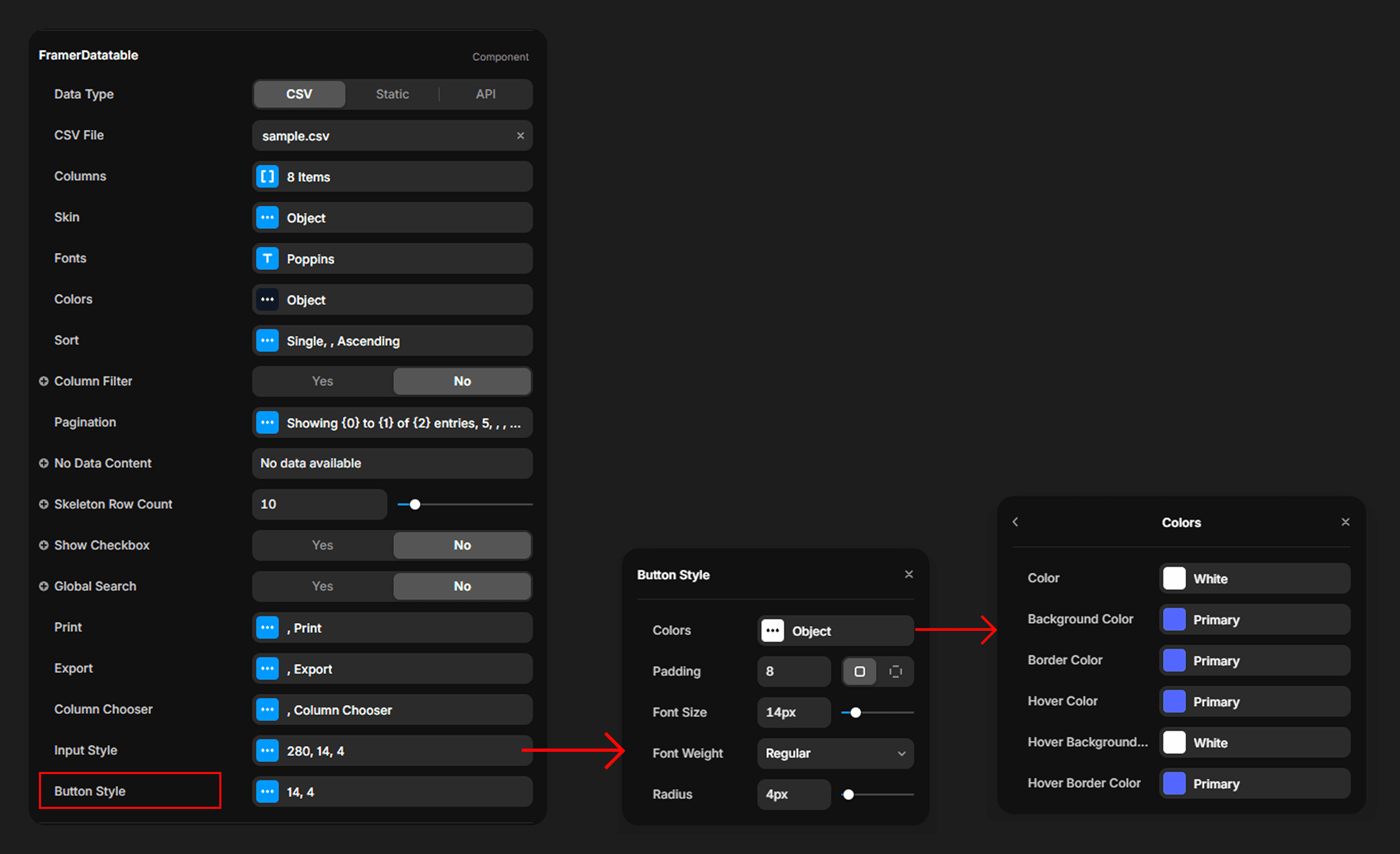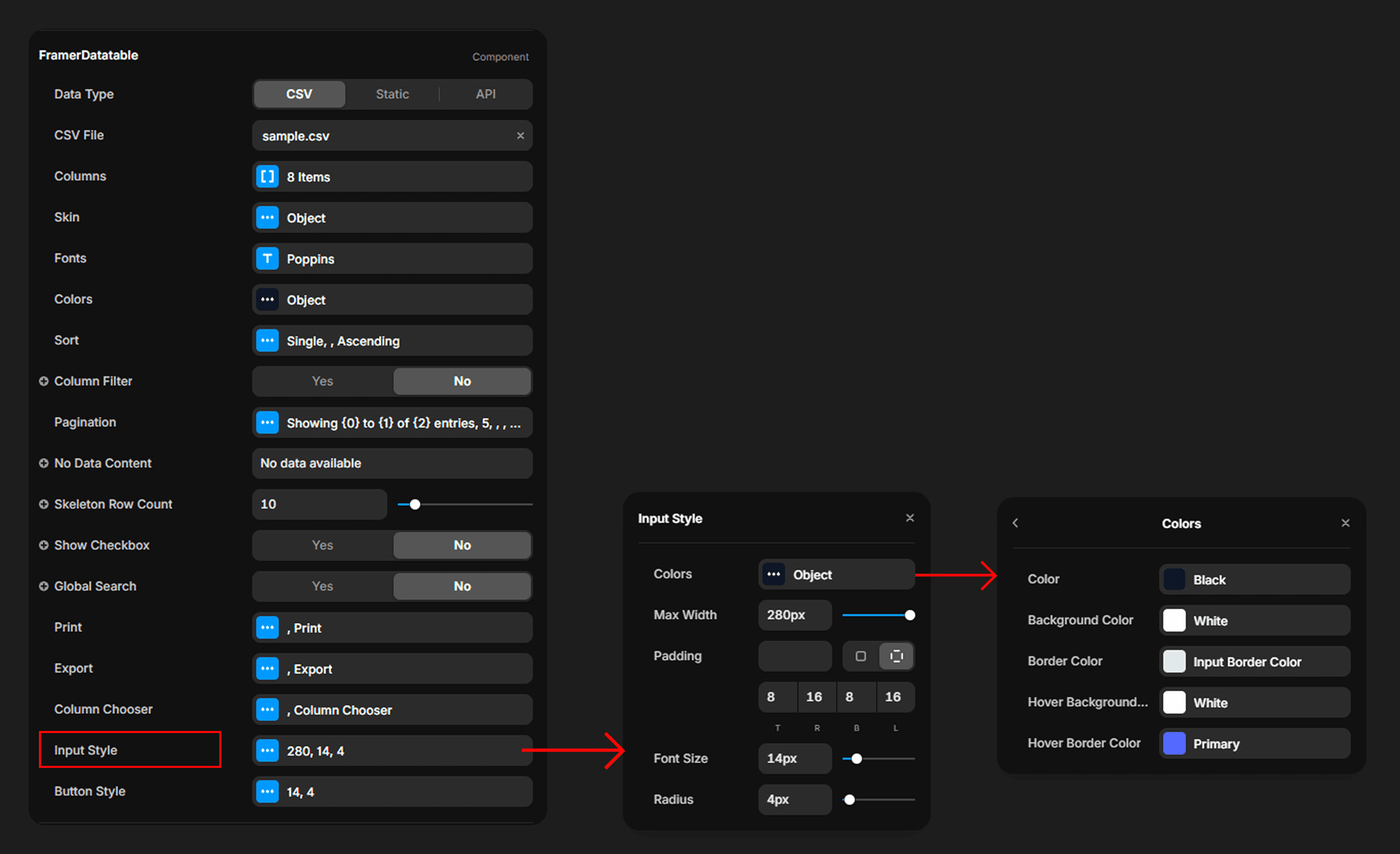 The search input and filter inputs share a unified input style object with configurable colors, padding, font size, border radius, max width, and hover/focus states.
