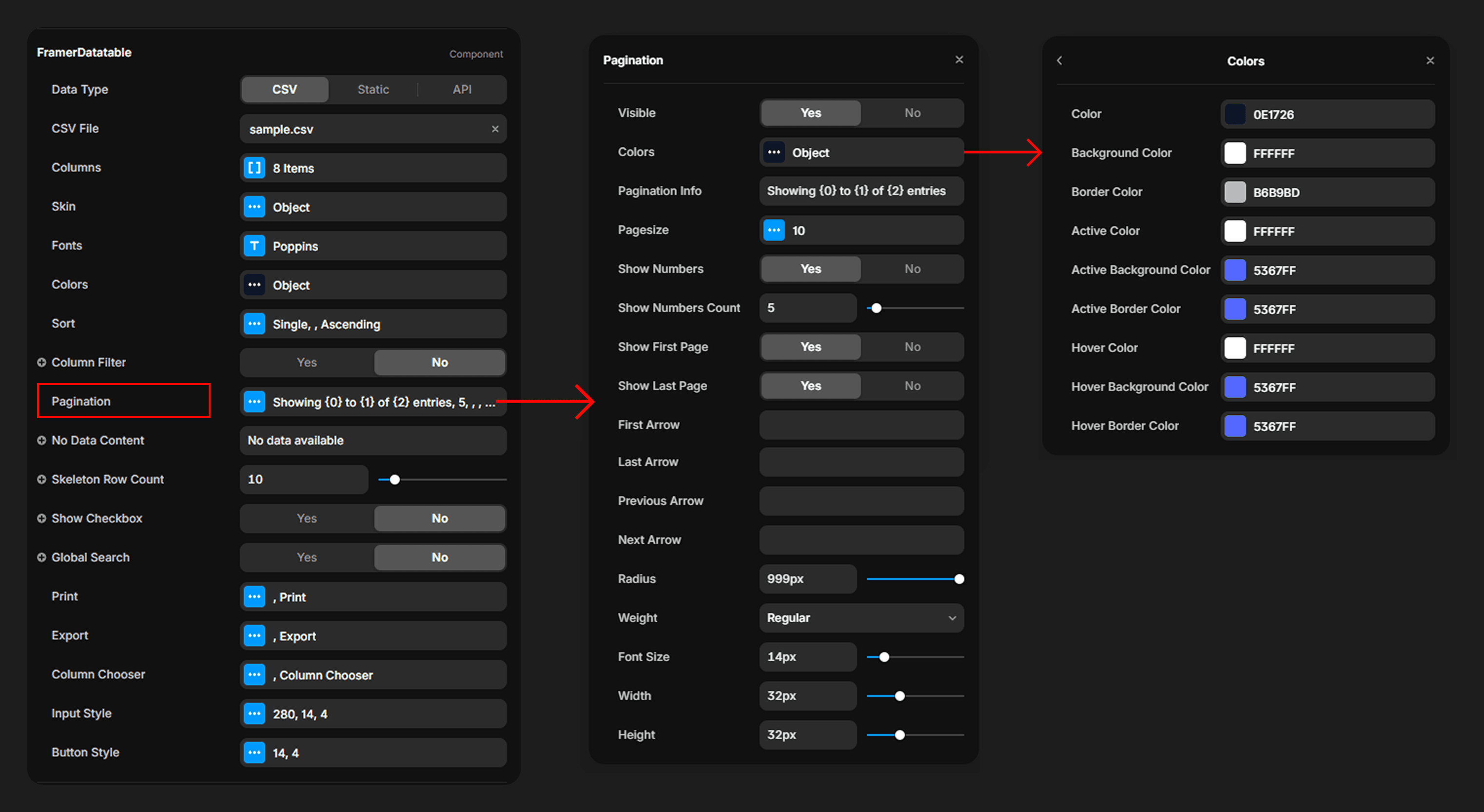 (10, 20, 30, 50, 100)with a visible page-size dropdown.First,Previous,page numbers,Next, andLastnavigation buttons — each individually toggleable.Configurable number of visible page buttons with smart windowing around the current page.